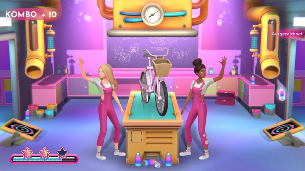 Es gibt aber auch Minispiele, die den Schwierigkeitsgrad nicht groß erhöhen. Hier ist unser Taktgefühl gefragt. Dieses funktionieren wie eine Art Rhythmus-Minispiele, bei dem es auf das perfektes Timing ankommt. Während der Rythmischen Minispiele läuft ein Soundtrack aus dem Barbie Dreamhouse Universum, der garantiert für einen Ohrwurm sorgt und ideal mit dem rhythmischen Tastendrücken harmoniert.