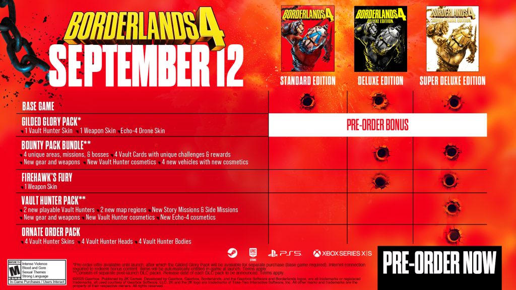 Alle Editionen sind ab heute vorbestellbar und erscheinen weltweit am 12. September 2025. Spieler:innen die eine der Editionen vorbestellen erhalten das Gilded Glory Pack* das einen Kammerjäger-Skin, ein Waffen-Skin und einen ECHO-4 Drohnen-Skin enthält.