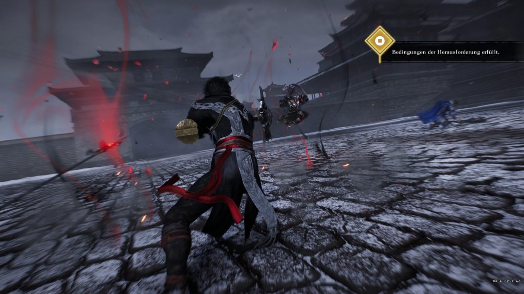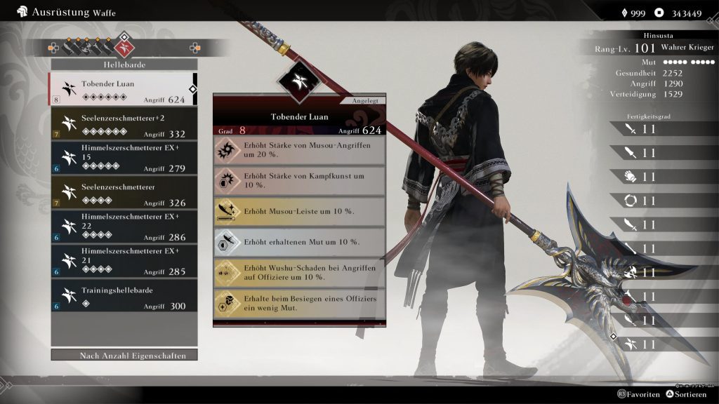Sollten wir während einer Schlacht feststellen, dass uns eine Waffe nicht zusagt, können wir sie jederzeit über das Ausrüstungsmenü wechseln. Hier lassen sich nicht nur neue Waffen anlegen, sondern auch unsere Battle Arts ändern. Außerdem können wir Talismane ausrüsten, die uns zusätzliche positive Buffs für die Schlacht verleihen. Allerdings ist zu beachten, dass Talismane und Pferde nur außerhalb einer Schlacht geändert werden können. Unsere Waffen können wir außerdem verstärken und individuell anpassen. Dabei lassen sich die Waffeneigenschaften austauschen, um eine ultimative Waffe zu schmieden, mit der wir jede Schlacht dominieren können. Eine Ausnahme bilden jedoch die „Luan“-Waffen, die aus speziellen Herausforderungen im höchsten Schwierigkeitsgrad freigeschaltet werden. Diese Waffen sind besonders mächtig, aber der Weg zu ihnen ist ebenso fordernd, da der höchste Schwierigkeitsgrad gnadenlos schwer ist. Für Fans, die ihre Fähigkeiten auf die ultimative Probe stellen wollen, ist dies jedoch eine spannende Herausforderung, die das Spiel zusätzlich bereichert. Doch aufgepasst … Mit gnadenlos schwer meine ich wirklich gnadenlos schwer.