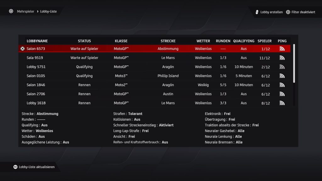 Ein weiterer Pluspunkt von MotoGP 24 ist die Möglichkeit, online gegen andere Spieler anzutreten. Das sorgt für zusätzliche Herausforderung und Spannung. Eine Art Rangliste existiert hierbei jedoch nicht. Der Onlinemodus läuft ohne Probleme und man kann seine Freunde direkt in die Lobby einladen. Hier kann man Privat für sich spielen oder auch einen laufenden Server auswählen, wo man sich mit anderen Mitstreitern messen kann.