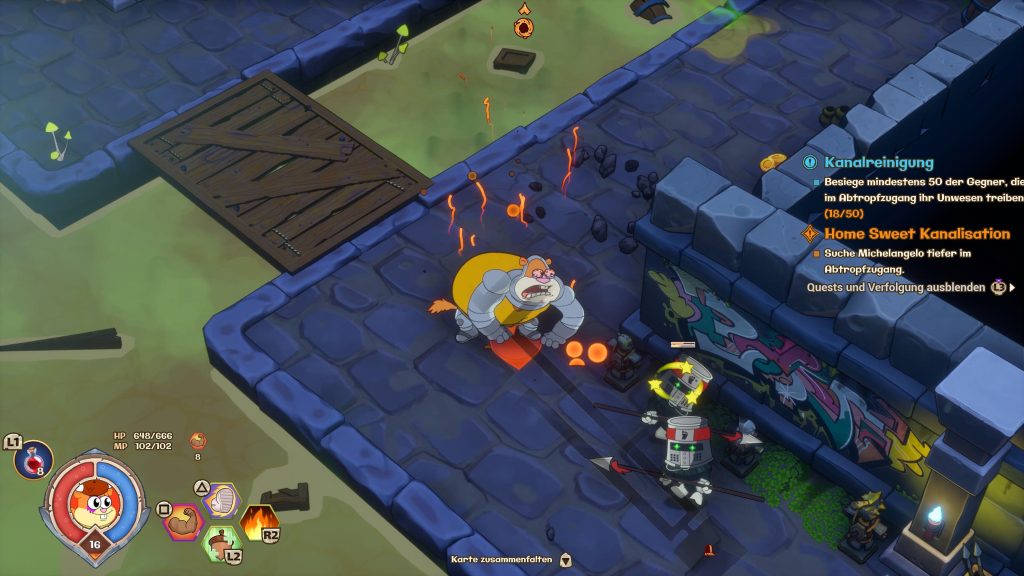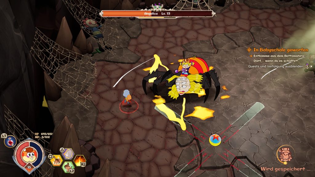 Das Gameplay von Nicktoons & The Dice of Destiny orientiert sich klar am Diablo-Prinzip. Ganz im Stile des großen Vorbilds erkunden wir gefährliche Dungeons, besiegen Gegnerhorden und sammeln dabei stetig neue Waffen sowie Ausrüstungsgegenstände. Besonders die Gestaltung der Dungeons sticht positiv hervor: Sie bieten nicht nur Abwechslung, sondern auch hohen Wiedererkennungswert, da sie direkt an ikonische Schauplätze der Nickelodeon-Serien angelehnt sind. So verschlägt es uns etwa auf die Quallenfelder aus SpongeBob Schwammkopf oder in die finsteren Abwasserkanäle der Ninja Turtles.