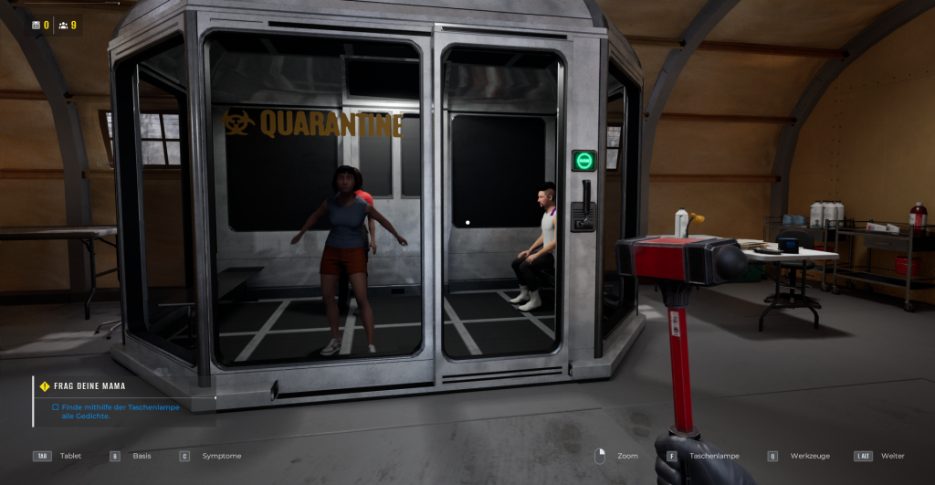 In Quarantine Zone übernehmen wir die volle Verantwortung für einen wichtigen Checkpoint. Während draußen das Chaos herrscht, liegt es an uns, mittels Untersuchungen und einer Prise Instinkt zu entscheiden, wer die sicheren Mauern der Basis betreten darf. Dabei geht es um weit mehr als nur schlichte Dokumente: Es ist wichtig, Symptome zu erkennen, Schmuggelware zu beschlagnahmen und die knappen Ressourcen der Basis effizient zu verwalten. Auch der Ausbau der Basis ist von Bedeutung, um ausreichend Schutz, Ressourcen und Betten zur Verfügung zu haben bis die nächste Evakuierung ansteht.