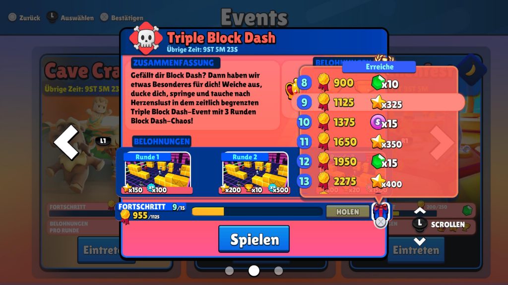 Fairerweise muss man sagen, dass es im Spiel auch Events gibt, bei denen man sehr viel grinden muss, um Stumble Coins oder Juwelen freizuschalten. Diese Events sind nur für eine bestimmte Zeit verfügbar, so dass man sich innerhalb weniger Tage anstrengen muss. Aber hier ist der Fortschritt unserer Meinung nach fair, denn wer viel Stumble Guys spielt, kann so den Premium Stumble Pass ohne zusätzliche Kosten freischalten. Ein Tipp von uns für mehr Skins, Emotes, Juwelen und Co. ist es die Cross-Progression zu nutzen, denn auf dem Handy bekommt man durch unsere Progression auf der Konsole einfach viel mehr Möglichkeiten an die kosmetischen Sachen zu kommen. Auch durch das Level-Up, was wir allerdings auf der PlayStation im Moment noch nicht haben. Schade ist allerdings auch, dass wir die PlayStation-Trophäen nicht über die Crossprogression per Auto-Pop freischalten können.