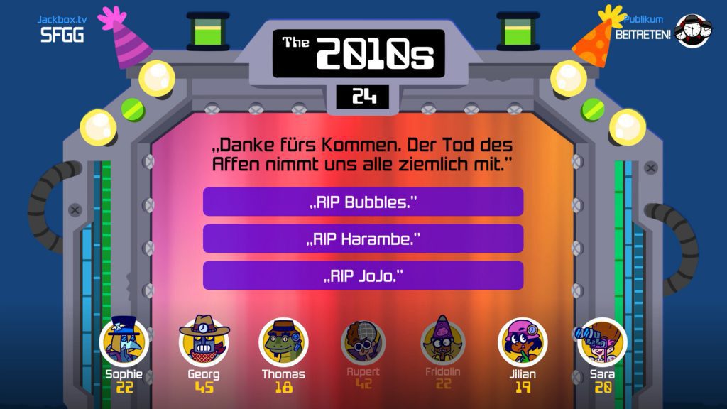 Auch die Trivia Games sind wieder mit von der Partie. Diesmal unter dem Namen TimeJinx. Es macht Spaß, die Fragen in der Gruppe zu beantworten, allerdings haben wir alle im Test Trivia Murder Party2 vermisst, das noch eine große Portion Humor mit sich brachte. FixyText hingegen hat uns auch in der Gruppe viel Spaß gemacht, da hier der Gruppenchat ins Chaos ausbricht. Hier macht das Spiel am meisten Spaß, wenn wir eine große Gruppe sind. Am wenigsten hat uns aber Hypnotorious gefallen. Dieser Modus war für uns im Test am Anfang sehr verwirrend und keiner wusste so richtig, wie das Spiel genau funktioniert. Wir hatten jedoch keinen Spaß an diesem Spielmodus, so dass wir relativ schnell wieder zu den anderen Spielen übergegangen sind.