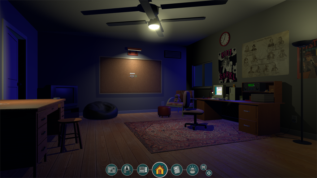 Die Steam-Version stellt nicht nur eine bloße Neuauflage dar, sondern eine umfassende Überarbeitung. Der bedeutendste und wesentlichste Unterschied zur ursprünglichen Game Jam-Version besteht darin, dass die KI-generierten Grafiken des Prototyps durch von Menschenhand erstellte Illustrationen ersetzt wurden. Es wurde Henning Ludvigsen engagiert, einen produktiven Digitalkünstler, der für seine Arbeiten an Brettspielen wie Star Wars und Clue bekannt ist. Das Ergebnis präsentiert eine visuell ansprechende und liebevoll gestaltete Welt, die den Charme der 90er Jahre perfekt einfängt. Besonders die 3D-Perspektive des Wohnzimmers, das als unsere Detektivzentrale dient, ist ein nettes Detail.