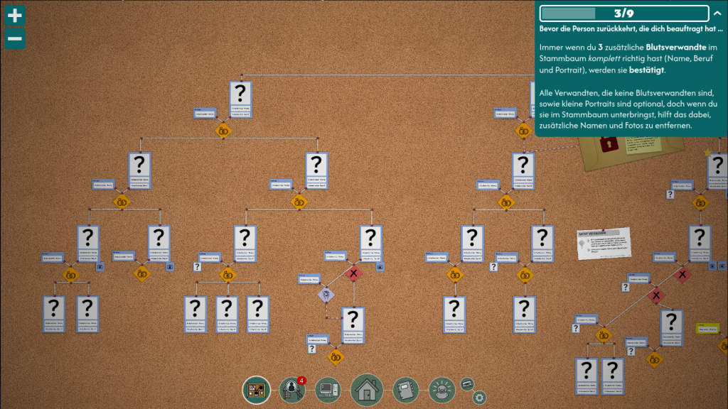 Besonders hervorzuheben ist dabei das einzigartige Notizbuchsystem. Während wir Texte lesen, besteht die Möglichkeit, wichtige Passagen zu markieren und diese mit einem einfachen Klick in unser Notizbuch im Spiel zu übernehmen. Das klingt simpel, ist aber unglaublich nützlich, um die Flut an Informationen zu organisieren und die Übersicht zu behalten. Indem wir jedes Feld des Stammbaums korrekt ausfüllen, verringert sich zwar die Anzahl der leeren Stellen, doch paradoxerweise werden die noch benötigten Beweise immer seltener und schwieriger zu beschaffen.